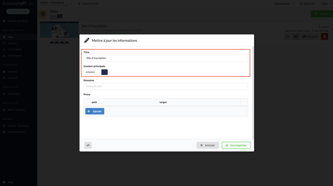 Le titre du site est visible uniquement en backoffice et non par vos participants.