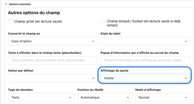 Dans les options avancées, vous pouvez également choisir d'afficher ou pas le nombre de places restantes des quotas :