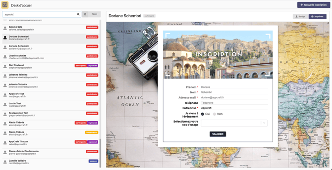 L'onglet Desk d'accueil vous permet la gestion des participants sur place : impression des badges, inscription de nouveaux participants..