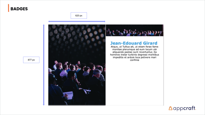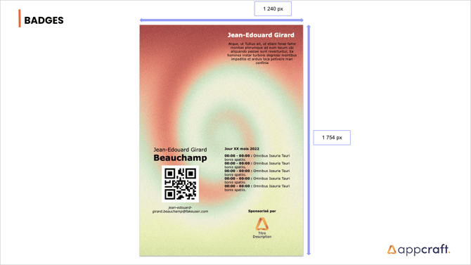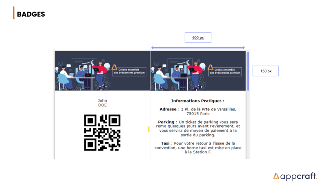 Dimensions - Badges Bannière [ L = 600 px ; H = 150 px ] Fond 1/4 [ L = 620 px ; H = 877 px ] Fond complet [ L = 1 240 px ; H = 1 754 px ] Découvrir également : • Pilotez des parcours complexes avec une simplicité absolue. • Gestion Roommates Evénementiel : La Solution AppCraft • Assemblée générale de la MAIF : Nantes 2019 • Pilotez vos participants avec la souplesse d'un tableur et la puissance d'un CRM. • AppCraft certifié ISO 20121