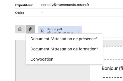 Une fois le document créé et le template paramétré, il vous suffit d'ajouter le document dans un mail à destination des participants. Pour ce faire, rendez-vous sur le module Mailing, selectionnez le template de mail dédié, et ajoutez un bouton avec le lien suivant :