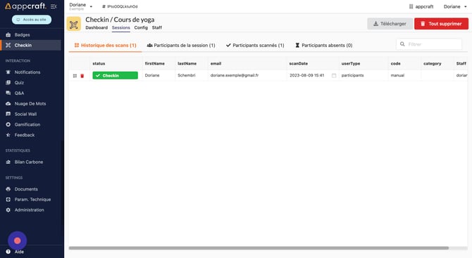 Cliquez sur les différentes entrées pour visualiser toutes les sessions de checkin de la liste.