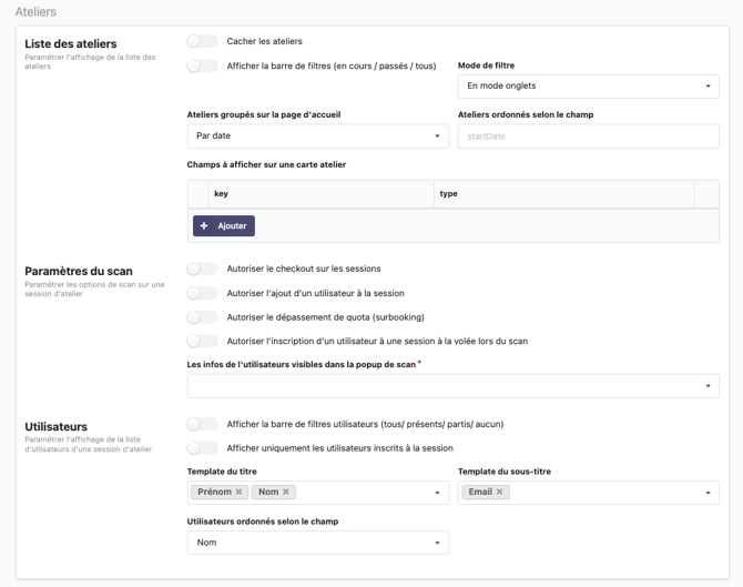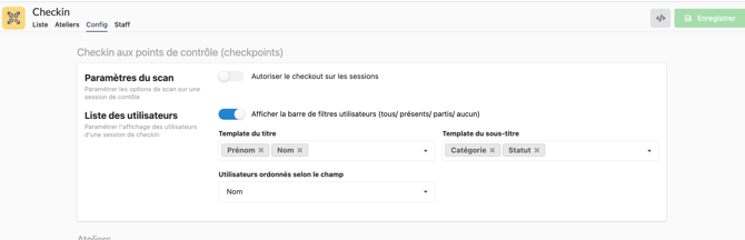 - Cacher les atelier : à activer si vous ne souhaitez pas afficher les ateliers sur l'application de checkin