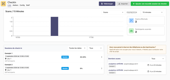 les workshops : ce type de checkin reprend automatiquement les sessions de votre programme, et permet de scanner les participants inscrits à ces sessions