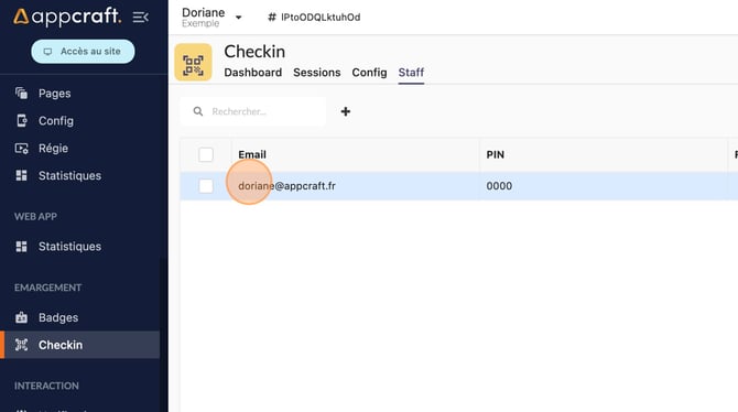 Créer des accès admin à l'app de checkin depuis l'onglet staff.Vous pouvez vous connecter simultannément au même compte ou créer un compte par personne.