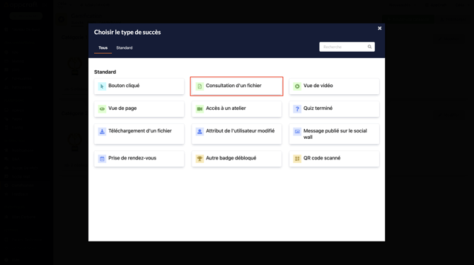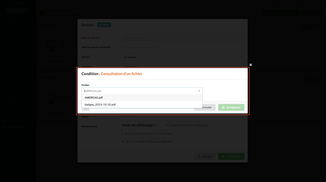 Cette action est liée à tous les blocs Files de votre plateforme, le participant débloquera un badge dès lors qu'il aura visionné le fichier souhaité.