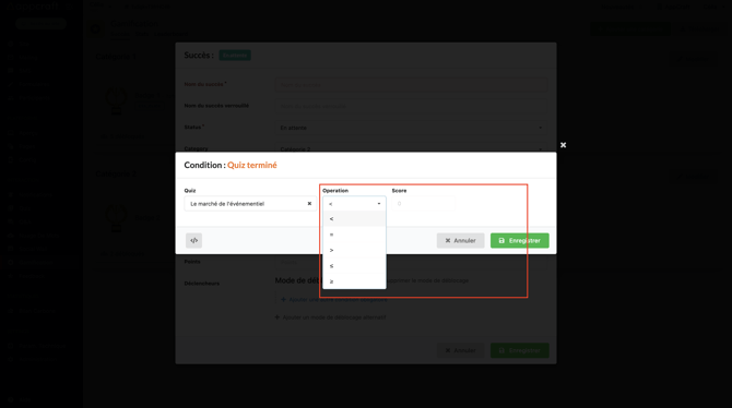 Dans le cas où le participant doit débloquer son badge selon un score spécifique réalisé au quiz, vous pouvez renseigner cette donnée à droite du quiz selectionné.