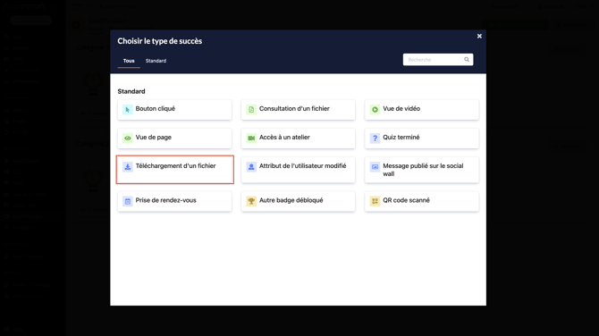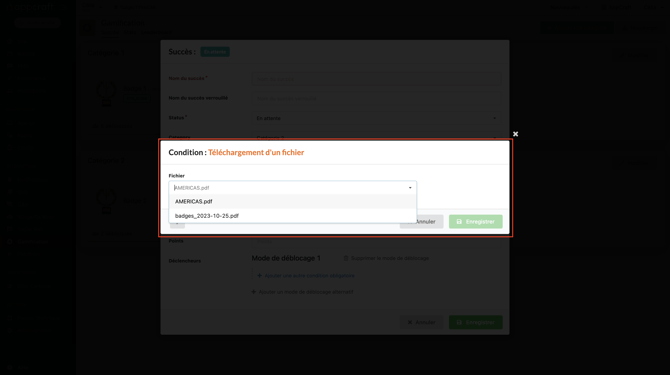 Cette action est liée à tous les blocs Files de votre plateforme, le participant débloquera un badge dès lors qu'il aura téléchargé le fichier souhaité.