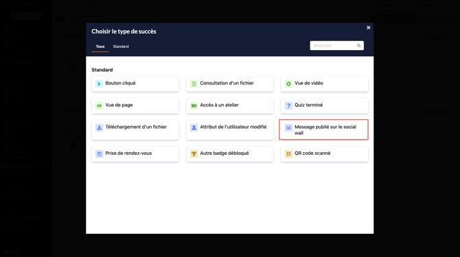 Cette action est liée à votre page spécifique Social wall de votre plateforme, le participant débloquera un badge dès lors qu'il aura :