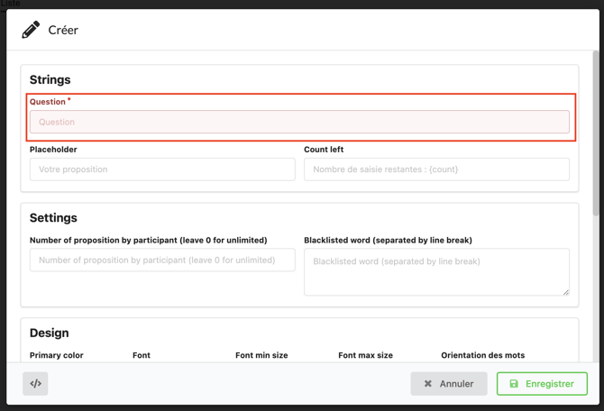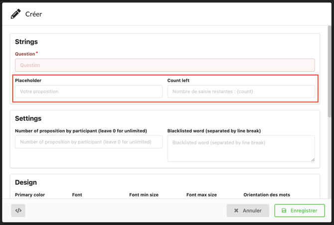 - Count left : Dans le cas d'un nombre limité de mot par participant, renseignez ici la phrase personnalisée lui indiquant son nombre de mots restants