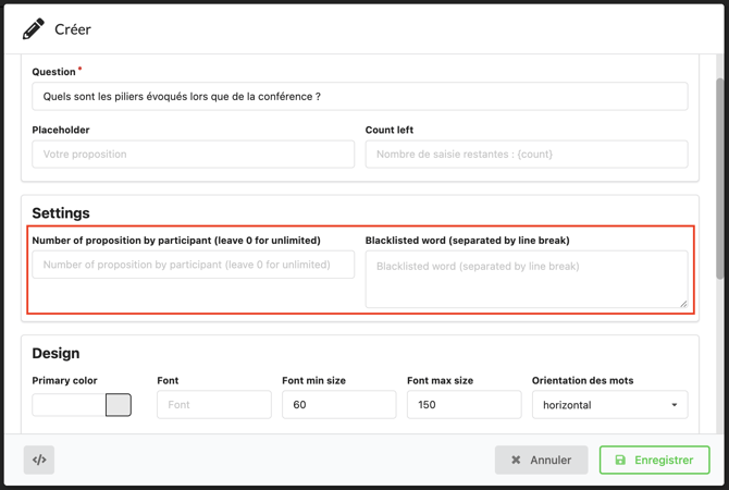 - Number of proposition by participant (leave 0 for unlimited) : Le nombre de mots autorisés par participant si vous souhaitez limiter