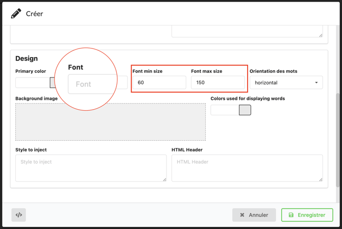 Si vous avez une police spécifique, renseignez son nom dans Font, puis personnalisez les tailles de mots sur votre nuage dans Font size.