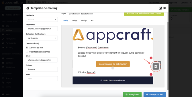 Une fois le bouton ajouté, cliquez sur la roue crantée pour intégrer le lien du questionnaire de satisfaction