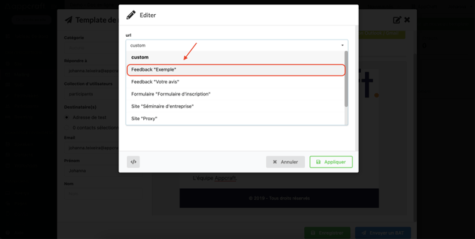 Pour intégrer un feedback dans un email, il vous faudra aller dans l'édition des Templates de mails puis sélectionner le Template de mail concerné ou créer un nouveau Template (voir formation sur les emails).