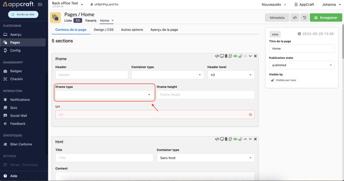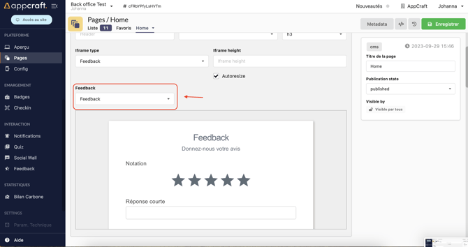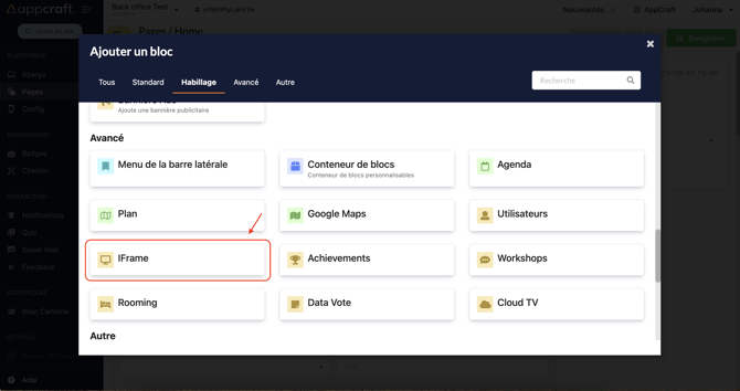 Pour intégrer un feedback sur la plateforme, vous devrez intégrer le bloc "Iframe" :