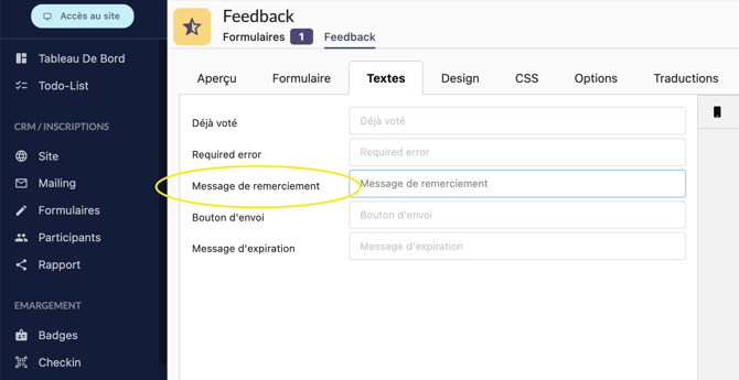 • Textes : Modifiez les textes qui apparaissent automatiquement sur le Feedback selon vos préférences.