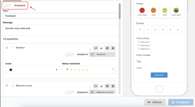 La page d'édition du Feedback (nommé "Formulaire") vous permet d'ajouter autant de questions que nécessaire à votre questionnaire et d'obtenir un aperçu en temps réel sur la partie droite.