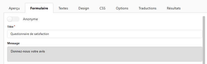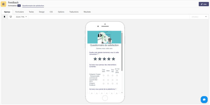 • Formulaire : Accédez à l'édition de votre questionnaire de satisfaction grâce à cette fonctionnalité.