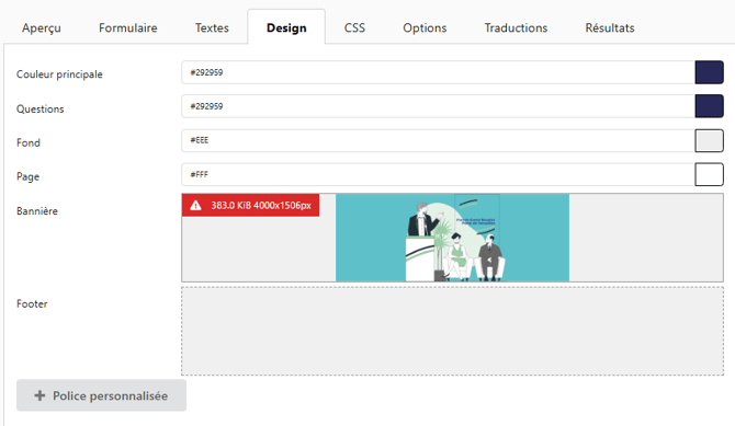 • Gestion des images (bannière et footer) : Grâce à cette option, vous avez la possibilité d'ajouter une bannière attrayante ainsi qu'un bas de page pour enrichir visuellement votre Feedback.