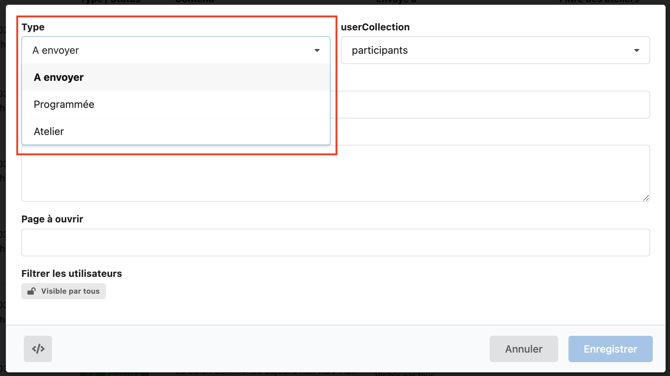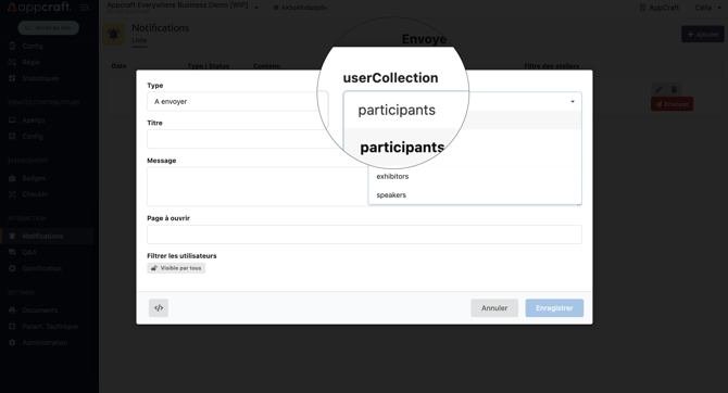 Vous retrouvez, dans votre pop-up de création de notification le menu déroulant userCollection.