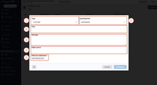 Pour permettre à vos participants de retrouver les différentes notifications envoyées, il vous est possible de créer un centre de notifications. Cette page sera disponible sur votre plateforme ou PWA, retrouvez la marche à suivre ici
