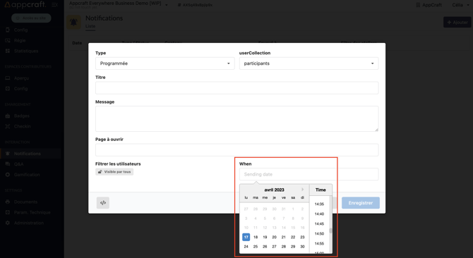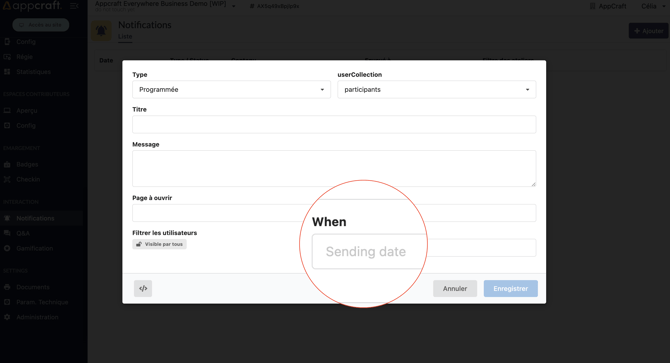 C'est grâce à ce champ que vous pourrez choisir la date et l'heure d'envoi souhaité de votre notification.
