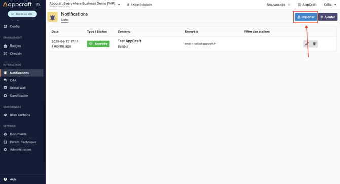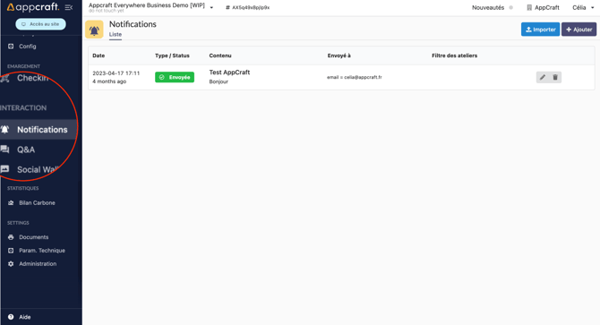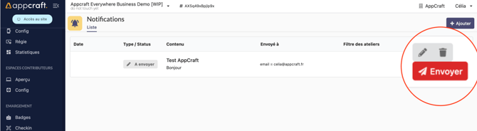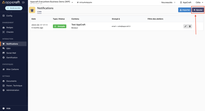 Une fois cela, vous aurez accès sur la page notification, au bouton "Envoyer une notification".