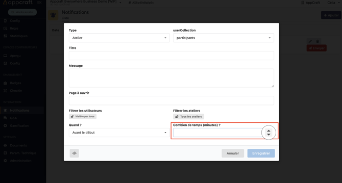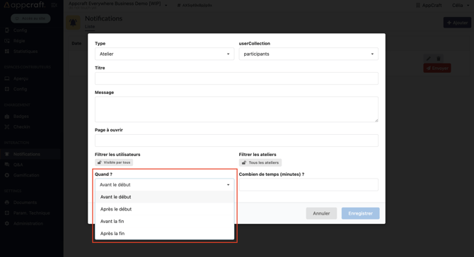 - Atelier : ce type de notification permet l'envoi de notification basé sur les horaires de votre programme