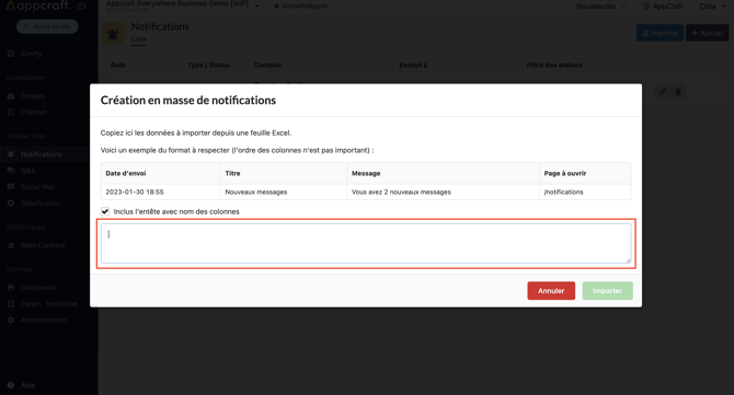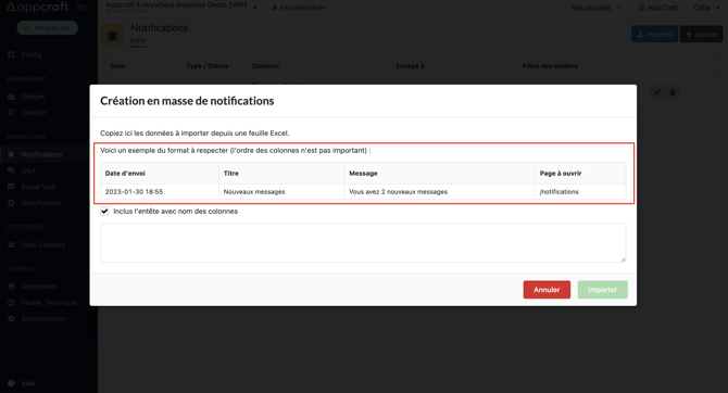 Il est également possible d'importer ce type de notification via un excel réalisé par vos soins.