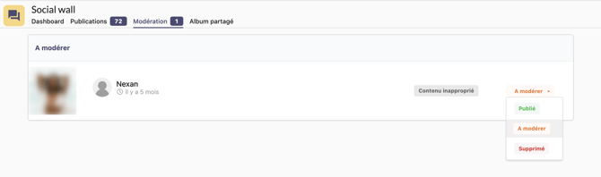 Vous pouvez activer la modération du contenu de votre Social Wall afin de contrôler les publications. Les posts à modérer apparaissent directement dans votre back-office. Vous pourrez ensuite choisir de supprimer le post ou de le publier si vous jugez que son contenu est approprié.