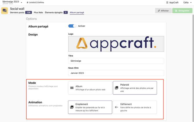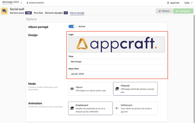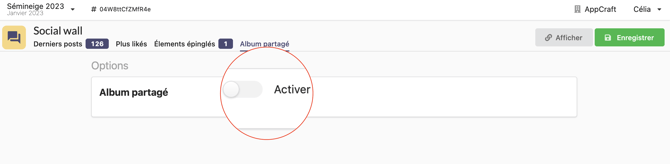 Le dernier onglet Album partagé, vous permet de générer et de personnaliser un album photo avec les posts de votre événement.