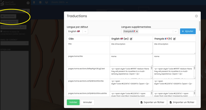 Puis sur Traductions, vous devrez alors indiquer, en choisissant en premier la "langue par défaut ", le texte que vous souhaitez ajouter de part et d'autre.
