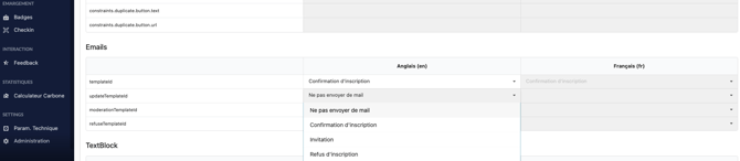 Un peu plus bas, vous avez la partie Emails, ici vous aurez la possibilité de choisir le mail qui partira en fonction de la langue dans laquelle le participant aura cliqué.