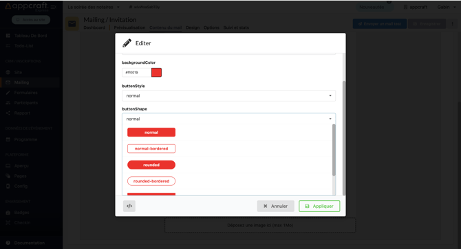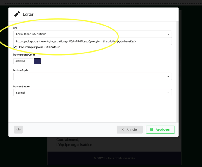 | Récapitulatif d'inscription | Intégrer le récapitulatif d'inscription de vos participants dans votre mail (si vous avez utilisé un formulaire AppCraft). |