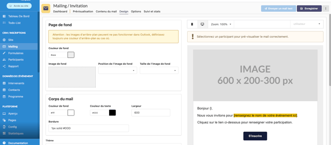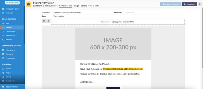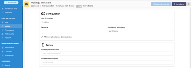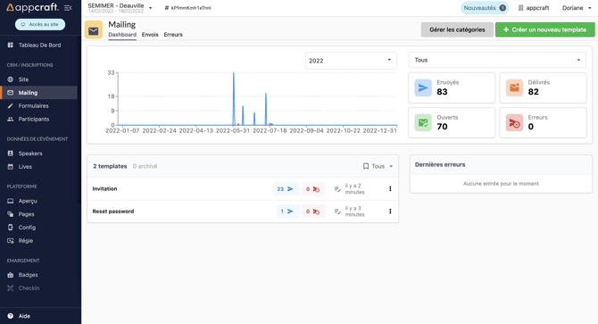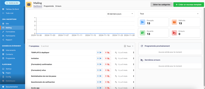 Le module Mailing vous permet de préparer les templates de mail que vous allez envoyer à vos participants, suivre les envois et répertorier les erreurs.