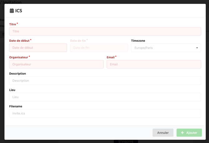 Pour créer une invitation agenda (aussi appelé .ics) appuyez sur l'icône calendrier et complétez a minima les champs obligatoires en rouge.