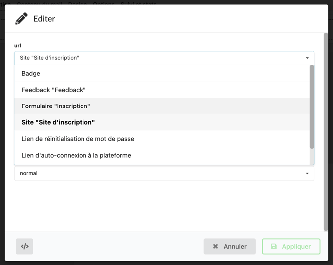 | Code | Permets d'intégrer du code HTML pour personnaliser son template de mail. |