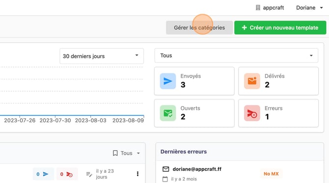 Pour gérer vos nombreux templates de mails, vous pouvez les catégoriser. Pour ajouter ou modifier une catégorie, cliquez sur Gérer les catégories.