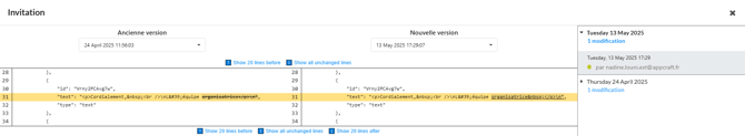 Vous avez la possibilité d'accéder à l'historique des modifications de votre mail en cliquant sur le bouton Historique. Une fenêtre contextuelle s'ouvrira, affichant la version actuelle à droite et la version précédente à gauche. Vous pourrez ainsi naviguer dans la liste à droite pour examiner toutes les modifications apportées antérieurement.