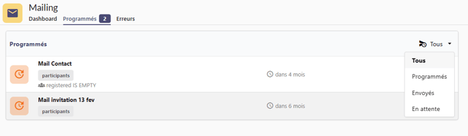 Vous avez également la possibilité de filtrer l'affichage des Mails programmés :