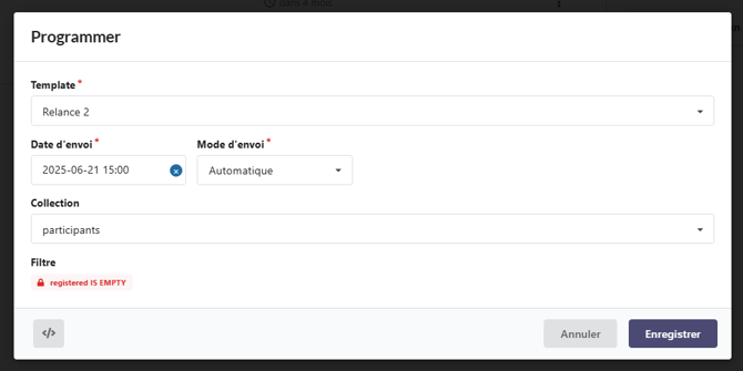 Dans ce cas, vous devrez sélectionner le modèle de mail à envoyer, définir la date et l'heure souhaitées, ainsi que choisir le mode d'envoi. Vous pouvez opter pour un envoi automatique, ce qui signifie que le mail sera envoyé automatiquement à l'heure indiquée, ou pour un envoi manuel, qui nécessitera que vous cliquiez sur le bouton "envoyer".
