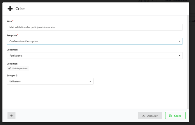 Le Mail peut également être envoyé à la création d'un participant. Il sera automatiquement envoyé au participant dès qu'il sera créé