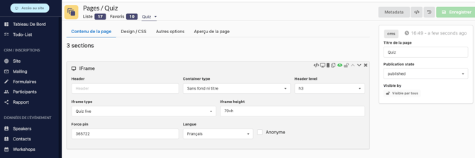 Pour ajouter le lien des participants dans la plateforme ou dans la solution mobile, vous devez vous rendre dans les "Pages" puis aller dans votre prévu à cette effet, exemple : Quiz de type CMS