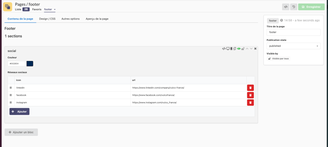 Vous pouvez ajouter vos réseaux sociaux dans la section "Social" de votre page footer.
