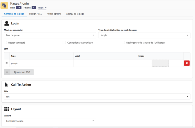Pour gérer le type de connexion souhaité sur votre plateforme, il est nécessaire de se rendre sur la page dédiée à la connexion, nommée Login.