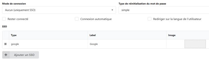 - Aucun (uniquement SSO) : vous devez configurer le type de connexion SSO, le label ainsi que l'image que vous souhaitez insérer si nécessaire.