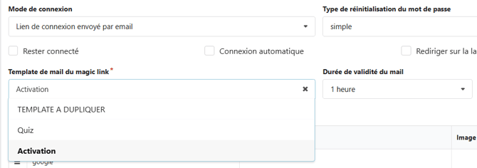 - Lien de connexion envoyé par mail : En optant pour ce mode de connexion, il est nécessaire de sélectionner l'adresse e-mail à partir de laquelle sera envoyé le lien au participant. Ce lien lui permettra d'obtenir un mot de passe à usage unique, et vous devrez également définir une durée de validité pour ce mail.