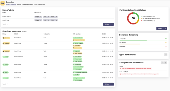 L'onglet dashboard permet d'avoir une vue globale de votre rooming, mais également de paramétrer vos types de chambres, et vos sessions de rooming