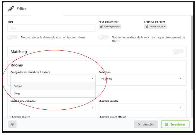 Les sessions de rooming permettent de paramétrer quels participants ont accès à quelle type de chambre, mais également de faire matcher les participants sur les chambres avec plusieurs personnes.