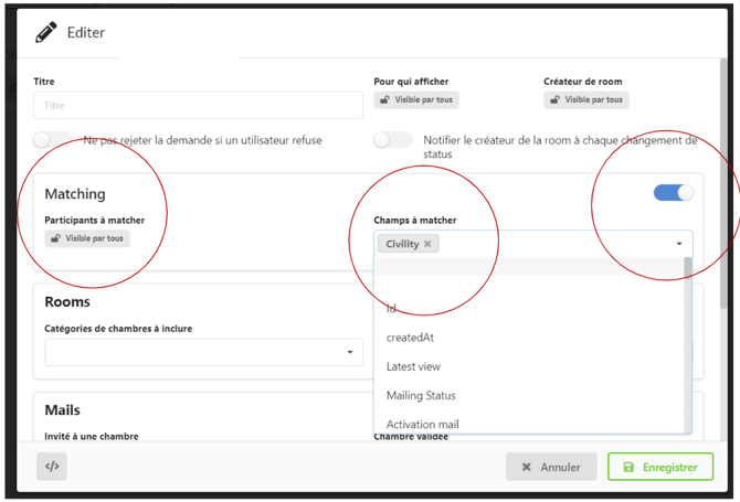 champs à matcher - Champs à matcher : vous pouvez sélectionner ici les champs des participants à matcher